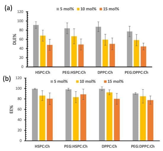 Figure 4a also shows that DS loading reached a plateau phase in all formulations at approximately 7 mol%. More explicitly, for the 10 mol% formulations, DLE% values were around 60%–68%, which correlates with 6–6.8 mol% actual entrapment of DS. Similar calculations for 15 mol% will lead to a 7 mol% actual entrapment of DS. Therefore, no significant increase in DS loading was observed by increasing the initial loading ratio of DS. These results became more obvious when we observed that the EE% for all formulations were similar for both 15 mol% and 10 mol% formulations as shown in Figure 4b (no significant differences; p > 0.05). This means that liposome bilayers were not able to entrap greater DS proportions, i.e., a maximum interaction between DS and the phospholipid was reached.