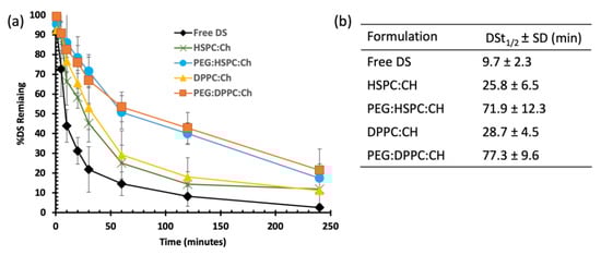As shown in Figure 5, both HSPC and DPPC liposomes demonstrated similar stability profiles, with significantly (p < 0.05) enhanced stability of loaded DS compared to that of the free drug. Almost 70% of free DS was degraded within the first 20 min, whereas an equal amount of loaded DS at both HSPC and DPPC liposomes took more than one hour to disappear. Furthermore, this time was extended to more than three hours upon PEGylation, regardless of the phospholipid composition. These differences are confirmed by the half-lives of DS in horse serum, which are extended by approximately three-fold for DS-loaded HSPC (25.8 ± 6.5 min) and DPPC (28.7 ± 4.5 min) compared to that of free DS (9.7 ± 2.3 min). The longest half-lives of DS were obtained after PEGylation; 71.9 ± 12.3 min for PEG-HSPC and 77.3 ± 9.6 min for PEG-DPPC (Figure 5b). Although the results show a slight difference between HSPC and DPPC liposomes, no statistically significant difference (p > 0.05) was observed between both phospholipids.