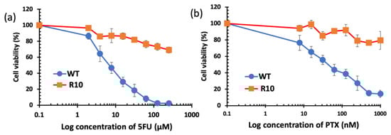 Survival curves (MTT cytotoxicity assay) of colorectal cancer cell lines H630WT and H630R10 with increasing concentrations of 5FU (a) and PTX (b) (n = 3 ± SD).
