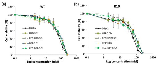 Figure 8 shows the effect of DS liposome formulations on the viability of H630R10 and H630WT cells. Cell viabilities of both cell lines were dependent on drug concentrations regardless phospholipid type (p < 0.05). The empty liposomes (no DS), used as a negative control, had no effect on the viability of both cell lines (Figure S3). This may suggest that the remaining ethanol resulting from the preparation methods had no contribution to the cytotoxicity of DS-loaded formulations. For both cell lines, DS completely inhibited the cell proliferation at the highest concentration (250 nM). Despite the apparent trend showing that the cytotoxicity of DS alone on both cell lines was also higher than that entrapped in liposome formulations, no statistically significant difference was found between the free and encapsulated drug (Figure 8, Table 2). Similarly, IC50 values of DS formulations show that the DS and its liposomal formulations were more toxic toward H630R10 than the sensitive cells H630WT; these differences are statistically insignificant (p > 0.05). The apparent reduced cytotoxicity of DS in liposome formulations might be attributed to the slow release profile of the drug from the formulations (Figure S1), or to nutritious lipids forming liposomes. It is worth noting that PEGylation had no significant effect (p > 0.05) on the cytotoxicity profiles of HSPC or DPPC DS-loaded liposomes despite the apparent differences amongst IC50 values for PEGylated and non-PEGylated liposomes. More investigation is necessary to study the influence of PEGylation on the cellular uptake of DS-loaded liposomes. However, we believe that the cytotoxicity of DS-loaded liposomes is more dependent on the DS release form the liposome rather than liposomal interaction with the cellular membrane.