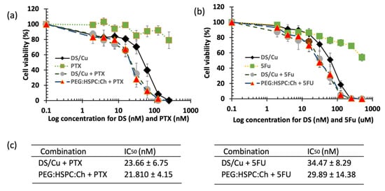 The MTT cytotoxicity assay. H630 R10 cell lines were exposed to different concentrations of DS formulations in combination with (a) PTX (b) 5FU. (c) The IC50 values of DS formulations in combination with (a) PTX (b) 5FU (n = 3 ± SD).