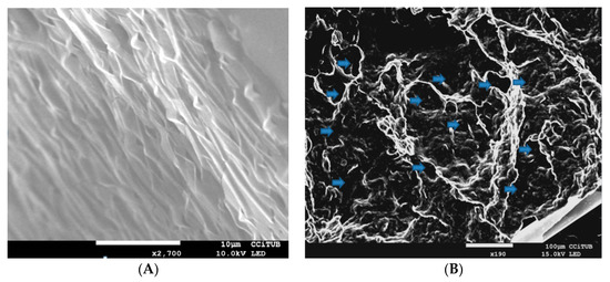 As shown in Figure 1A,B, SEM revealed a laminar disposition in the gel formulation. The layers were regularly organized and a porous structure was evident.