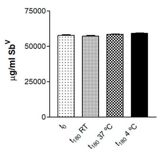SbV was quantified by ICP-OES (Inductively coupled plasma-optical emission spectrometry, Perkin Elmer Elan 6000, Waltham, MA, USA) after previous treatment of the samples with HNO3 and H2O2 in a microwave digester at 220 °C for 72 h. The drug content was evaluated at the beginning and end of the 6-month experiment.