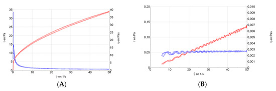 The MA gel formulation exhibited pseudoplastic behavior (Cross model; r2 = 0.9997) (Figure 4A). Viscosity at 50 s−1 was 677.8 ± 1.76 mPa·s, and it was non-thixotropic. The MA solution showed Newtonian behavior (Newton model; r2 = 0.9967) (Figure 4B) and viscosity at 50 s−1 was 2.67 ± 0.06 mPa·s.