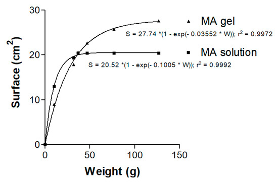 The equation that best fitted the spreadability behavior of the MA gel and solution followed a first-order kinetic model [S = Smax × (1 − exp(−k × W))], where S is the extension surface (cm2), Smax is the maximum extension surface (cm2), k is the kinetic constant (g−1) and W is the weight added (g). The resulting graphics and equations are shown in Figure 5. Spreadability of the MA gel increased as more weight was applied, until a maximum value was reached.