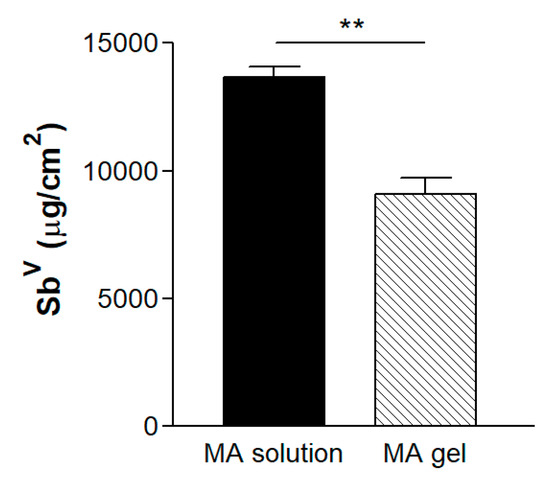 After 55 h the amount of SbV released in the receptor compartment through the hydrophilic polypropylene membranes was 13,646.53 ± 960.63 µg/cm2 of SbV for MA solution and 9081.13 ± 1446.20 µg/cm2 of SbV for the gel, corresponding to a release of 32.3 ± 3.56% and 21.5 ± 3.43%, respectively, from the total amount seeded. The differences (p < 0.01) between the SbV released from the solution and the gel are statistically significant (Figure 6).