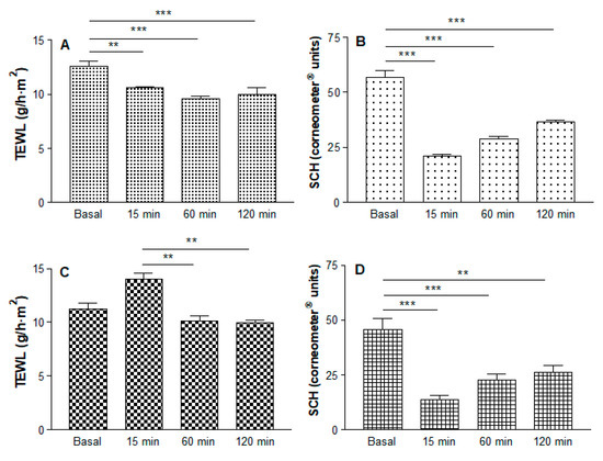 Measurements of biomechanical parameters of skin for 2 h after application of the gel and solution. (A) Change in trans-epidermal water loss (TEWL) and (B) Stratum corneum hydration (SCH) values after application of MA solution. (C) Change in TEWL and (D) SCH values after application of MA gel (** p < 0.01; *** p < 0.001).
