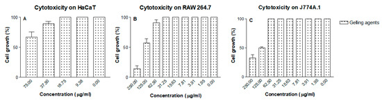 Cytotoxicity of the gelling excipients in cell lines (A) HaCaT, (B) RAW 264.7 and (C) J774A.1.
