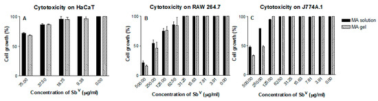 Figure 8 and Figure 9 show the cytotoxic effects on the cell lines assayed. No cytotoxicity was observed in the keratinocyte cell line HaCaT at the ranges of dilution tested. The gel formulation with and without MA showed cytotoxicity in the RAW264.7 and J774A.1 cell lines only at the highest concentrations of the gelling excipients and SbV assayed. The CC50 of the MA gel and the gel alone are summarized in Table 3 and Table 4.