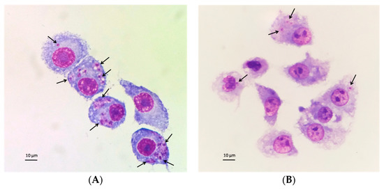 Effect of the MA gel on the infection of J774A.1 macrophages with L. infantum. (A) Infected and untreated control cultures. (B) Cultures treated with 15.63 µg/mL of SbV of the MA gel. Amastigotes are indicated by arrows.