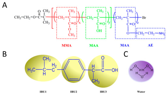 Coarse-grained models of (A) block copolymer poly(MMA-co-MAA)-b-PAEMA, (B) ibuprofen, (C) water.