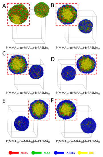 Next, the effect of pH-sensitive PMAA block on the self-assembly of IBU-loaded PMs was studied, as shown in Figure 3. The morphological appearance of poly(MMA-co-MAA)-b-PAEMA PMs with MAA numbers of 0, 13, 23, 33, 43, and 53 (i.e., MAA fraction of 0, 18%, 25%, 33%, 38%, and 44%) were visualized using DPD method. It could be observed that all types of PMs presented a spherical morphology with a typical core-shell structure. As seen in Figure 3A, IBU-loaded PMs self-assembled from poly(MMA30-co-MAA0)-b-PAEMA38 showed a core-shell structure. The micellar shell was formed by PAEMA segment, and the micellar core was composed of an MMA segment (red beads) and IBU molecules (yellow beads). Furthermore, the MMA segments and IBU molecules were distributed randomly in the core. With an increase of the block ratio of the MAA segment, the middle layer was gradually formed by MMA and MAA segments (red and green beads) (Figure 3B–F). In Figure 3B,C, few MMA segments were distributed in the core of IBU-loaded PMs, resulting in reduced drug loading content. Moreover, some IBU molecules were distributed in the middle layer. When the block ratio of the MAA segment was 33% (Figure 3D), the typical onion-like IBU-loaded PMs were formed, indicating reasonable drug loading content and pH-triggered drug release profile. When this ratio was higher than 33% (Figure 3E,F), few MMA and MAA segments (red and green beads) were found in the shell of IBU-loaded PMs, leading to burst drug release. Therefore, IBU-loaded PMs self-assembled from the block copolymer with 33% of the MAA segment would be optimal for formulation.