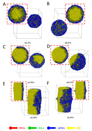 During the self-assembly process of system, there were another two elements: water and drug. Here, the effect of fraction of water on the self-assembly of the system was firstly studied, as shown in Figure S1. It has been reported that the shape of the amphiphilic copolymer NPs depended on the water content [51]. As shown in Figure S1, the effect of the mole fraction of water in solutions on the formation of IBU-loaded PMs was investigated. When the molar fraction of water was 60% (Figure S1A), the system formed a sandwich-like structure, and the drugs (yellow beads), MMA (red beads) segment and MAA (green beads) segment self-assembled into the middle layer. When the mole fraction of water was increased to 67% (Figure S1B), the sandwich-like structure began to rupture. When the mole fraction of water was further increased (Figure S1C,D), a columnar structure was gradually formed. When the water content was increased above 80% (Figure S1E–I), the copolymer was completely phase separated from water to form spherical PMs. The simulation results showed that the mole fraction of water in the solution influenced a balance between the water and block copolymer, resulting in different structures. Next, the effect of the fraction of the drug in the feed on self-assembly of the system was investigated. The self-assembly of the drug-loaded system with different drug contents (2 to 25%, mole/mole) was simulated by the DPD method, as shown in Figure 4. At 2% IBU in the feed, the drug molecules were able to be well encapsulated into the micellar core, but few MMA (red beads) and MAA (green beads) segments were found in the core (Figure 4A) which indicated more IBU molecules could be loaded, resulting in low drug-loading capacity. When the ratio of the drug was 6%, the typical three-layered onion-like IBU-loaded PMs could be observed (Figure 4B). Almost all IBU molecules were well encapsulated in the micellar core. Clear MMA and MAA segments-constructed middle layers and PAEMA segment-constructed shells were observed. When the ratio of drug in the feed was higher than 6% (Figure 4C–F), the drug molecules undergoing the phase separation were not encapsulated in the core. Furthermore, the spherical shape was changed to irregular column shape. Therefore, 6% IBU in the feed was the optimal formulation during preparation of IBU-loaded PMs.