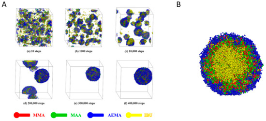 (A) Self-assembly process of IBU-loaded poly(MMA30-co-MAA33)-b-PAEMA38 PMs with 6% IBU in aqueous solution. (B) Cross-section view of IBU-loaded poly(MMA30-co-MAA33)-b-PAEMA38 PMs with 6% IBU at 400,000 steps during DPD simulation.