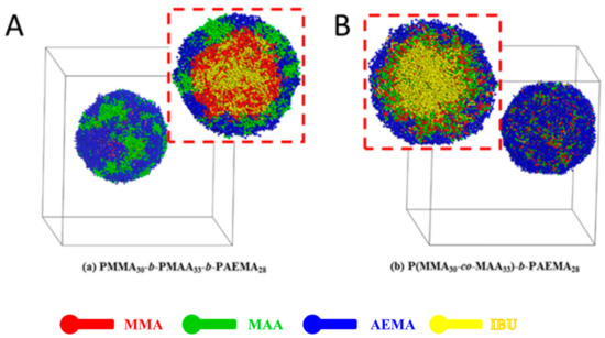 Next, the effect of the topological structure of the copolymer on self-assembly and drug distribution of IBU-loaded PMs was studied. Random block copolymer (poly(MMA-co-MAA)-b-PAEMA) and precise linear block copolymer (PMMA-b-PMAA-b-PAEMA) (chemical structures were showed in Figure S3) were used to complete the DPD simulation, and the results are shown in Figure 6. As reported, when the thermodynamic properties of two or more blocks in the core were incompatible, the micellar core was segregated into different phases, resulting in “spheres in spheres” (core-shell model, onion-like) and “spheres on spheres” (raspberry-like) [53,54,55]. Therefore, IBU-loaded PMs self-assembled from the precise linear block copolymer, which showed raspberry-like morphology due to MMA and MAA blocks in sequence (Figure 6A), while PMs based on random block copolymers exhibited onion-like PMs (Figure 6B). In Figure 6A, the micellar core was formed by IBU molecules (yellow beads) and MMA (red beads). By contrast, the micellar core of onion-like PMs was formed by IBU molecules. PMMA and PMAA self-assembled into the middle layer, resulting in better protection of encapsulated drugs and pH-triggered drug release profile. In addition, the onion-like PMs with PAEMA shell (blue beads) showed a much higher positive charge in comparison to raspberry-like ones with a hybrid shell (blue and green beads), leading to higher mucoadhesivity. The results suggested that the random topological structure of the block copolymer possessed higher potential for oral drug delivery compared with precise line analogue.