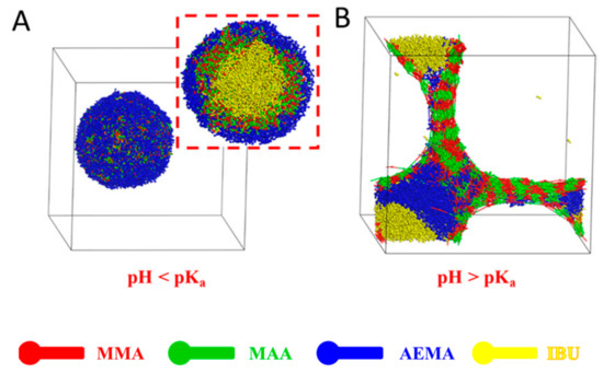 The aggregate morphologies of IBU-loaded PMs at different pH values were further studied by DPD simulation, as shown in Figure 7. When the pH was lower than the pKa of the pH-sensitive PMAA segment, copolymer molecules were able to self-assemble into a typical core-shell structure together with IBU molecules with spherical morphology, resulting in three-layered onion-like PMs (Figure 7A). As seen in Figure 7A (cross-section view), IBU molecules (yellow beads) were encapsulated into the micellar core, and PMMA (red beads) and PMAA (green beads) segments formed the middle layer. The hydrophilic PAEMA (blue beads) segments self-assembled into a micellar shell. When the pH was higher than the pKa of the pH-sensitive PMAA segment (Figure 7B), the carboxylic acid residues in the PMAA segments lost protons and were ionized, leading to transformation of the solubility from hydrophobicity to hydrophilicity that broke the hydrophilicity–hydrophobicity balance. Therefore, the dismicellization of IBU-loaded PMs was observed. The curled poly(MMA-co-MAA) chain stretched and the drug was released from the system. Due to the fact that the pKa of the carboxyl group in the PMAA segment was about pH 5–6, the PMAA block was dissolved in the simulated intestinal fluid and was stable under acidic conditions of simulated gastric fluid. In summary, the IBU-loaded PMs were stable, and drug molecules were well protected in the micellar core at pH < pKa. However, the typical core-shell structure was destroyed, showing an irregular nanostructure at pH > pKa. These findings indicated that the encapsulated cargos were stable in acidic conditions of gastric juice and released triggered by basic pH value in intestinal tract, suggesting that the PMs could be used in oral drug delivery.