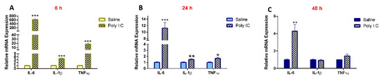 As compared to saline controls, the mRNA expression of IL-6, IL-1β, and TNF-α in the kidneys was significantly higher in the poly I:C-treated groups at 6 and 24 h. While the levels of IL-1β and TNF-α returned to baseline at 48 h, levels of IL-6 remained significantly higher at 48 h in the poly I:C-treated group (Figure 1). Maternal serum concentrations of IL-6 were elevated by approximately 16-fold at 6 h after poly I:C administration (p < 0.05) and returned to baseline by 24 h, as determined by ELISA [17].