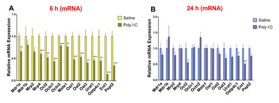 As compared to saline controls, the mRNA expression of Mdr1a, Mrp4, Oct2, Octn1, Octn2, Mate1, Oat1, Oat2, Oat3, Urat1, Oatp4c1, Ent1, and Pept2 was significantly lower in the poly I:C group at 6 h post-treatment (Figure 2A). Conversely, the mRNA expression of Mdr1b and Mrp2 remained unchanged at 6 h. At 24 h post-poly I:C administration, the mRNA expression of most transporters returned to saline levels except for Oct2, Oatp4c1, and Ent1 (Figure 2B). At 48 h post-poly I:C administration there was no difference in mRNA expression between the poly I:C-treated and saline-treated groups (Supplementary Materials, Figure S1).