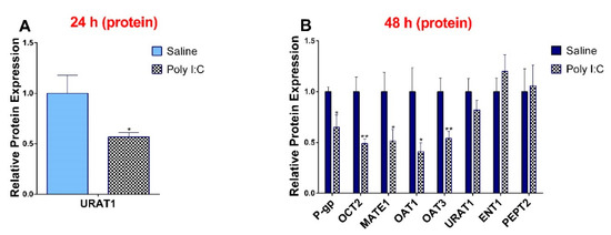 In accordance with observed 6 hr transcript level changes, the protein levels of P-gp, OCT2, MATE1, OAT1, and OAT3 were significantly lower in the poly I:C group at 48 h (Figure 3). At 24 hr, only the protein expression of URAT1 was significantly decreased (Figure 3) and levels of OCT2 and ENT1 remained unchanged (Supplementary Materials, Figure S2). While the protein expression of URAT1 was significantly decreased at 24 h, it returned to its baseline at 48 h. We did not see any impact of poly I:C on protein expression at 6 h post-injection (data not shown).