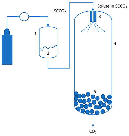 Schematic representation of the rapid expansion of supercritical solutions (RESS) process. 1—Extraction unit, 2—active pharmaceutical ingredient (API; solute) powder bed, 3—atomizing nozzle, 4—precipitation unit, and 5—size-reduced API.