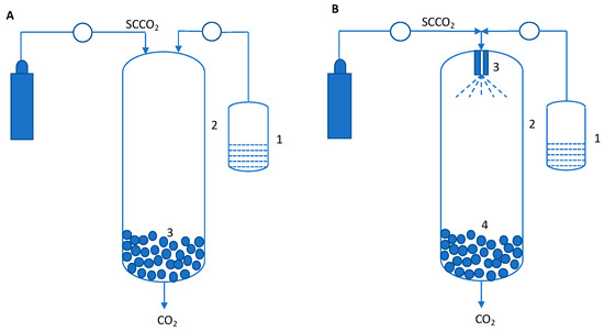 In spite of the improved solubility of solutes in SCFs, the actual solubility compared to those in typical liquid solvents is low. Thus, utilizing the SCF as an antisolvent or as a co-antisolvent significantly expands the operating space for SCF processes. This process has been referred to as the gas antisolvent method (GAS) and was first introduced in 1989 [35]. The solute (or solute + carrier) is dissolved in an SCF miscible solvent to the desired concentration. Some examples of solvents that meet this criterion are alcohols (ethanol/methanol/propanol), ketones (acetone), and dimethyl sulfoxide. This solution is then introduced into SCF CO2 (can also be liquid or gas), which acts as an antisolvent to help create supersaturation in the solution (Figure 2A). This process is similar to antisolvent-driven precipitations, which are commonly used separation techniques in the chemical industry. However, in contrast to a typical antisolvent process, the use of SCF CO2 is able to generate very high supersaturations, thereby leading to high nucleation rate, resulting in smaller particles. In addition, GAS has also shown to be useful in controlling the solid form for pure compounds and co-crystals [36,37,38,39].