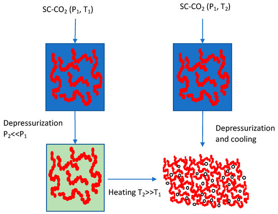 Schematic representation of SCF-based methods to make polymer foams. Left: Introduction of SCF CO2 at a pressure P1 and temperature T1 (<Tg), followed by depressurization and heating to remove trapped CO2. Right: Introduction of SCF CO2 at a pressure P1 and temperature T2 (>Tg), followed by simultaneous depressurization and cooling to remove SCF CO2. o: Represents bubbles in the polymer foam.