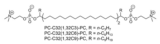 In the case of lateral hexyl (C6) and nonyl (C9) alkyl chains, i.e., PC-C32(1,32C6)-PC and PC-C32(1,32C9)-PC, we could demonstrate that these groups are sufficient to fill the void volume in a mixed bolalipid/phospholipid membrane when unsaturated phospholipids, that is POPC or DOPC, are used [53]. As a result, we were able to produce for the first time storage-stable liposomes (bolasomes) composed of POPC and DOPC with 20 mol% of PC-C32(1,32C6)-PC and PC-C32(1,32C9)-PC, respectively.