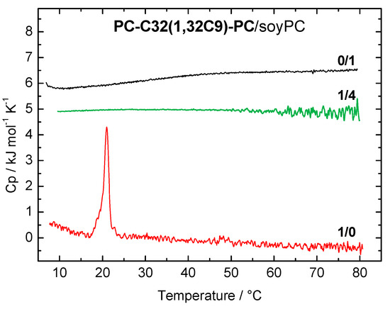 The DSC heating curves of the PC-C32(1,32C9)-PC/soyPC mixture (1/4, n/n; green line) and both pure components PC-C32(1,32C9)-PC (red line) and soyPC (black line), respectively, are shown in Figure 2. Pure soyPC showed no phase transition in the temperature range investigated (5–80 °C), which is due to the fact that the main transition temperature (Tm) of soyPC is below 0 °C. Depending on the fatty acid composition of natural phospholipids, Tm can vary between −50 and −20 °C [60]. The bolalipid PC-C32(1,32C9)-PC shows a transition at Tm = 20.8 °C and it self-assembles into fibers below and sheet-like aggregates above this Tm [52]. In the 1/4 mixture of PC-C32(1,32C9)-PC and soyPC (Figure 2, green line), no transition can be observed in the DSC heating curve. This indicates a good miscibility between both components, which is also found for PC-C32(1,32C9)-PC/POPC and /DOPC mixtures, respectively [53].