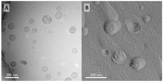 Cryo-TEM is considered the gold standard for the visualization of lipid vesicles, since the shape and structures of these vesicles are preserved very close to their native state [61]. When compared to TEM of stained samples, neither contrasting agents nor drying procedures are needed for cryo-TEM during sample preparation—both could lead to artefacts [62]. We therefore prepared cryo-TEM and FFEM samples of a 1/4 mixture of PC-C32(1,32C9)-PC/soyPC in PBS at pH = 7.4. The results are shown in Figure 3.