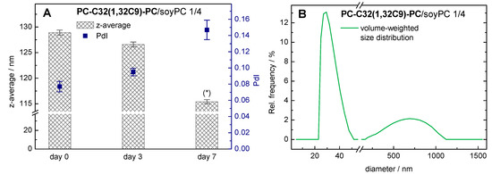 With the use of DLS, the autocorrelation function obtained can be analyzed using the cumulant fit, from which we can get the hydrodynamic diameter (z-average) and the PdI for the vesicular aggregates. For the PC-C32(1,32C9)-PC/soyPC 1/4 mixture at day 0, a z-average of 129 nm and a PdI of 0.08 were obtained (Figure 4A).