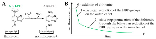 (A) Reduction of the green-fluorescent 1,2-dipalmitoyl-sn-glycero-3-phosphoethanolamine-N-(7-nitro-2,1,3-benzoxadiazol-4-yl) (ammonium salt) (NBD-PE) to the non-fluorescent 7-amino-2,1,3-benzoxadiazol-4-yl (ABD-PE) using dithionite. (B) Schematic representation of the two-step fluorescent decay using the dithionite assay. For details please refer to the text.