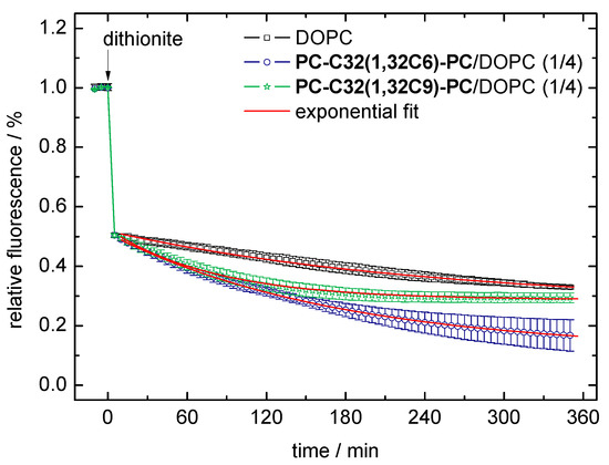 Data of the dithionite assay using 1,2-dioleoyl-sn-glycero-3-phosphocholine (DOPC) vesicles (black scattered data), PC-C32(1,32C6)-PC/DOPC (1/4, n/n; blue scattered data), and PC-C32(1,32C9)-PC/DOPC (1/4, n/n; green scattered data) bolasomes, respectively. Data points and error bars represent the mean and s.d. from three separate experiments. The red line corresponds to the exponential fit of the data points starting at t = 5 min.