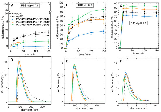 (A–C): Calcein release of different liposomal formulations during 3 h of incubation at 37 °C in (A) phosphate buffered saline (PBS) at pH = 7.4, (B) simulated gastric fluid (SGF) at = pH 1.0, and (C) simulated intestinal fluid (SIF) at pH = 8.0. (D–F): Volume-weighted particle size distribution of vesicle suspensions after 4 h of incubation at 37 °C in (D) PBS at pH = 7.4, (E) SGF at pH = 1.0, and (F) SIF at pH = 8.0. As liposomal formulations, pure DOPC (black squares, dashed line), pure phospha-tidylcholines from soy beans (soyPC) (black diamonds, dotted line), PC-C32(1,32C6)-PC/DOPC (1/4; blue data), PC-C32(1,32C9)-PC/DOPC (1/4; orange data), and PC-C32(1,32C9)-PC/soyPC (1/4; green data) were used.