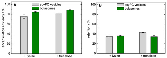 In order to assess the stability of our vesicles during the lyophilization process, the retention of calcein was investigated. After freeze-drying with lysine as cryoprotectant, a calcein retention of 34.8 ± 0.9% was determined for soyPC vesicles and 36.1 ± 0.9% was found for the corresponding bolalipid-modified vesicles (Figure 8B, left-hand side). These values are comparable to values found the calcein retention using freeze-dried phospholipid vesicles and monosaccharides as cryoprotectants [92]. Hence, the use of bolalipid vesicles showed no advantage, but also no disadvantage, compared to classical unmodified vesicles regarding the stability during freeze-drying. With the use of trehalose as a cryoprotectant, the calcein retention was slightly increased to 43.1 ± 0.3% when soyPC vesicles were used. Here, the addition of 20 mol% PC-C32(1,32C9)-PC resulted in a slight decrease in calcein retention (34.5 ± 2.4%; Figure 8B, right-hand side). Therefore, the reasons remain unclear for now. Also the over-all lower calcein retention compared to other studies [59,88,92], when trehalose is used as cryoprotectant, should be clarified in the future.