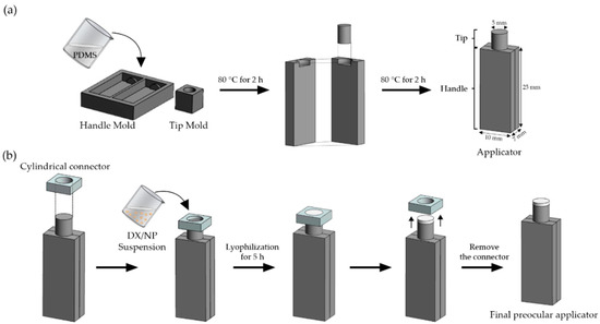 Schematic illustration of the fabrication of the DX/NP tablet-loaded applicator. (a) Fabrication of the PDMS applicator. (b) Tablet preparation on the tip of the applicator.
