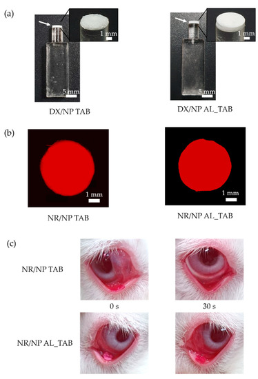 Characterizations of tablets. (a) Representative optical images of the applicator with the DX/NP TAB and DX/NP AL_TAB. White arrows indicate the dry tablets prepared on the applicator tip. (b) Representative fluorescence images of the NR/NP TAB and NR/NP AL_TAB. (c) Disintegration profiles of the NR/NP TAB and NR/NP AL_TAB administered topically to rabbit eyes.