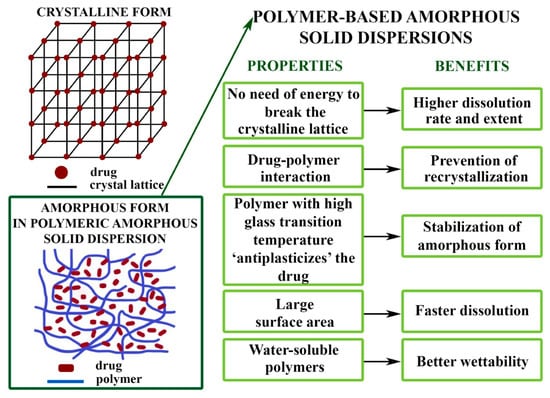 Preparation and formulation of ASDs have evolved a lot since then not only concerning research and development but also in practical application. It can be stated that numerous pharmaceutical formulation publications are relating to drug-loaded, polymer-based amorphous systems due to their advantageous properties compared to the crystalline form (Figure 1). Although several impediments can be excluded by forming ASDs other, hitherto unknown pitfalls can emerge. One of the major troubles is that physical instability might turn up; therefore, recrystallization of the amorphous system befalls during storage [20,21]. This can be avoided for instance by choosing an appropriate polymer as a matrix that “antiplasticizes” the drug (raising its glass transition temperature) and/or forms intense interaction with the drug [9]. However, not only does the polymer influence the stability but the physicochemical characteristics of the drug, the ratio of the components and preparation methods also have an impact on the quality [22]. In conclusion, developers have to consider all of these factors during designing applicable ASDs.