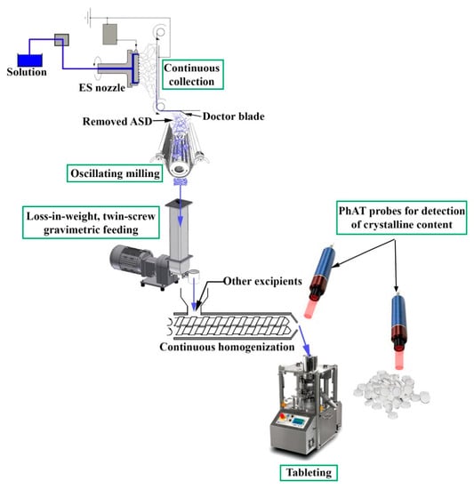 Balogh et al., published a research paper in which continuous end-to-end production of an ASD-based solid form was accomplished [68]. During this work, electrospinning was introduced as an advanced linking technology between the synthesis of acetylsalicylic acid and its formulation into orally dissolving webs. Continuous preparation of the solution for electrospinning means the key step of connection flow reaction and electrospinning. If the polymer has no chemical interaction with the reactants, it can be added to the API solution during the synthesis. Otherwise, the polymer needs to be added right after the synthesis. Electrospinning allows the simple and quick removal of reaction solvents via fast evaporation. Therefore, crystallization, filtration, and drying can be excluded this way. In addition, continuous cutting and collection of the layered fibrous webs were successfully achieved by coupling Raman spectroscopy to the system.