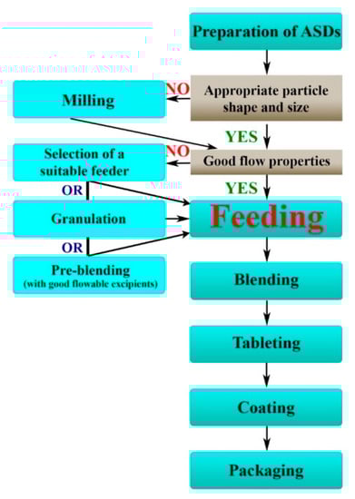 On the other hand, handling of the poorly flowable powders can be facilitated via granulation or by using excipients with good flow properties. In the context of ASDs, HME can be the most obvious method to simultaneously increase the dissolution properties and the flowability of APIs [57]. A good opportunity can be the application of other commonly used wet or dry granulation methods. However, there are some extra challenges during the granulation of ASDs with these widely used techniques. For instance, mechanical strength during roller compaction or moisture content during wet granulation has a huge impact on the stability and on the release of the amorphous API; therefore investigating the trace crystallinity is very important in these cases. Successful roller compaction of evacetrapib-loaded ASDs and wet granulation of indomethacine-loaded ASDs proves the feasibility of the granulation processes in this field [85,86]. However, it is important to note that a feeding step is also needed before continuous granulation thus this kind of flowability enhancement is usually used before the tableting and not before the blending [87]. The third option can be the pre-blending of the poor flowable materials with excipients, which usually means a semi-continuous processing step during tablet manufacturing. For the above-mentioned reasons, granulation and pre-blending are worth using only in case of powders with extremely critical flow properties. If it is possible, selection of an appropriate feeder can be the most convenient way.