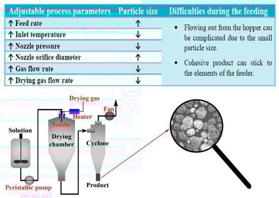 The morphology of the spray-dried materials and thus the flow properties can vary according to the adjusted values on the spray dryer (Figure 5) [123]. Regarding this, Vehring et al., highlight in their experiments that particle formulation during spray drying is strongly influenced by the relationship between surface recession and diffusion of the solutes [124]. Consequently, changing the components and therefore the viscosity of the starting solution will have an effect on the morphology of the products at the same conditions. This observation is also supported by Goddeeris and Van den Mooter who prepared free-flowing spray-dried samples [125]. The aim of their research was to maximize the dissolution extent of a model API, which was successfully performed by adding a surfactant (d-α-tocopheryl polyethylene glycol succinate 1000) to the polymer–drug composition. However, Carr’s index and the Hausner ratio decreased with an increasing amount of the surfactant, which indicates better flowability. This can facilitate the downstream processing later on. Ramesh et al., also added an extra excipient, microcrystalline cellulose, to the solution before spray drying, which was suitable to increase the flowability of the spray-dried samples [126]. Another widely-used method for improving the flow properties of the spray-dried particles is the roller compaction [127]. For instance, Angi et al., were applied dry granulation to reach better flowability and reduce the electrostatic charging of the small particle-size samples prepared by spray drying [128]. The spherical shape of the samples did not change after the granulation process but large agglomerates were visible in the scanning electron microscopy images. These agglomerates seemed to be favorable in the flowability point of view since the granules were characterized with better flow properties according to the Hausner ratios and Carr’s indices.