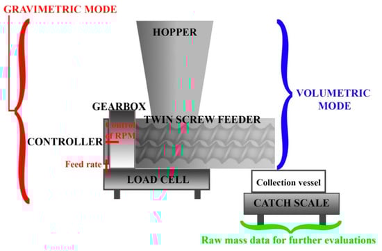 Most commonly used pharmaceutical feeders operate on the principle of loss-in-weight (LIW) and mostly consist of one or two screws (Figure 6). Weighing platform (load cell) is the inherent part of this type of feeders because it ensures the ability to control the feed rate. Basically, LIW feeders can be used in two different modes. The simpler operation is the volumetric mode whereby the moving elements have constant rotation speed. In contrast, the gravimetric method applies the signal of the load cell to control the rotation of the screws based on the mass flow. This unit operation can handle flow variability caused by bulk density changes relating to the emptying of the feeding hopper [139,140]. As a consequence, gravimetric feeding is a promising method in case of ASDs as well since the bulk densities can vary in a wide range, especially if different size agglomerates are prepared during granulation processes. In addition, a catch scale is usually utilized to gain data from the outlet of the feeder, which give useful information about the feedability and it could also have a significant contribution to the feedback control [84].