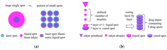 (a) Schematic illustration of the possibility of incorporating a high amount of active pharmaceutical ingredient (API) into the drug delivery system (DDS) by dividing one large singe spot into a spot pattern; (b) drug depot consisting of a stack of a defined number of single drug spots (or spot pattern) in consecutive layers.