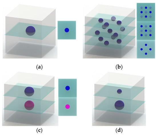 Schematic illustration of the different test specimens: (a) specimen with one single depot (blue ink); (b) specimen with 13 individual depots over three planes (blue ink), sectional views of corresponding planes; (c) specimen with blue and pink ink depots placed with two printheads in two separate planes; (d) specimen for the long-term diffusion study with two differently sized ink depots (blue ink).