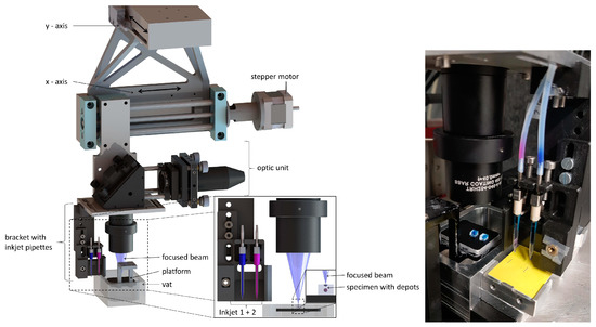 A CAD model of the hybrid AM system and the assembled experimental setup are depicted in Figure 4. The optical unit was mounted on horizontal x–y axes driven by stepper motors. While the x-axis (high helix lead screw module, igus GmbH, Cologne, Germany) was used as a scanning axis and therefore needed to be moved quickly, the linefeed was done by a slowly moving y-axis (PLS85 4”, PI miCos GmbH, Eschbach, Germany). As inkjet printheads, two single-nozzle Nano-Tip J piezoelectric pipetting tips from GeSiM (Gesellschaft für Silizium-Mikrosysteme mbH, Radeberg, Germany) were chosen for integration into the SLA system. The printheads were driven at a voltage of U = 100 V, a pulse width of tp = 50 µs and a frequency of f = 100 Hz. The printheads were mechanically connected to the carrier of the optic unit using a bracket. The bracket also served as mechanical protection. The distance of the printhead tips to the upper surface of the vat was adjusted to 1.5 mm. The printheads were filled with the drug or ink solutions by a syringe via a flexible tube. Water-sensitive paper could be positioned on a platform next to the vat (yellow paper in Figure 4 right). The inkjet printheads were moved over the sheet and printed up to five droplets on the paper prior to every depot loading step for every layer.