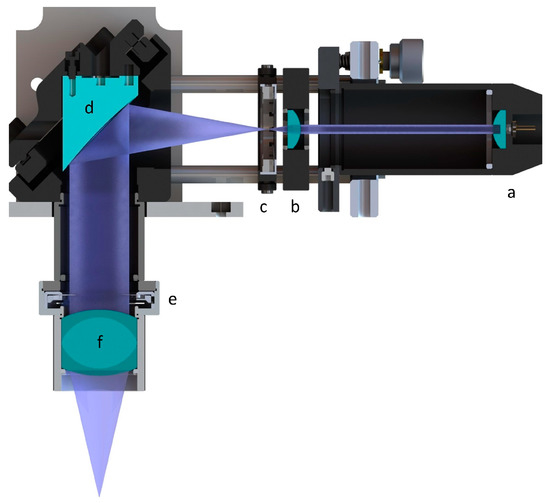 Cross-section of the new optic unit; (a) laser diode (with aspheric lens); (b) plan-convex lens; (c) iris; (d) off-axis parabolic mirror; (e) iris; and (f) Hastings achromatic triplet.