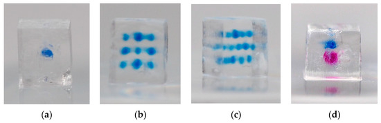 The specimen with one single depot featured a clearly visible single blue ink depot (see Figure 6a). No major blurring could be observed. This test basically demonstrates the creation of a single depot with relatively sharp contours containing a total of 19.7 nl of blue ink solution within a PEGDA base structure. The specimen with multiple ink depots was built successfully (Figure 6b, top view, and 6c, angular view). All depots were clearly visible. Blurring could be observed. The blurring effect was increased optically due to the overlay of depots of the different planes. Four depots in the top view of Figure 6b appear larger than the others due to the direct overlay of depots in first and the third plane (compare with Figure 3b). Every single depot contained 19.7 nl of blue ink solution, leading to a total ink solution volume of 256.1 nl for all depots. The third test demonstrates successfully (see Figure 6d) that two different ink depots can be implemented in one single PEGDA base structure. Both ink depots can be clearly distinguished. The depots contained 19.7 nl of blue and 20.5 nl of pink ink solution, respectively. A higher blurring effect could be observed for the pink ink depot, leading to the impression of a larger depot volume.
