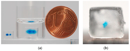 (a) Side view of the Poly(ethylene glycol) diacrylate (PEGDA)-based specimens with two differently sized depots containing 19.7 nl and 39.4 nl of blue ink solution after 14 days of storage (left specimen: dry storage in sample bag at room temperature, right specimen: storage in ultrapure water at room temperature); (b) side view of the PEGDA-based drug delivery system (DDS) with a central depot containing 55.65 ng of Coomassie blue-labeled bovine serum albumin (BSA).