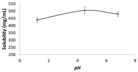 The solubility pH profile for pravastatin at pH 1.2, 4.5, and 6.8 was 439.80 ± 17.42, 503.87 ± 24.20, and 479.58 ± 17.39 mg/mL (Figure 1). As expected considering its acidic nature, the lowest solubility was obtained at the lowest pH. The highest strength/dose of pravastatin (40 mg) would be soluble in 0.09 mL of water at pH 1.2. Dose number (Do) is 3.20 × 10−4. Therefore, pravastatin is a highly soluble drug. ANOVA test and Scheffé post hoc comparison detected differences in the solubility values at pH 1.2 versus the higher pHs, while no differences were detected between solubility values at pH 4.5 versus 6.8.
