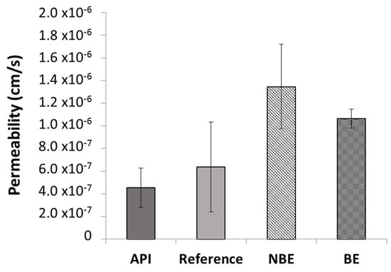 Pravastatin permeability values of the application programming interface (API) (358 µM), reference, non-bioequivalent (NBE), and bioequivalent (BE) formulations. Error bars represent the standard deviation.
