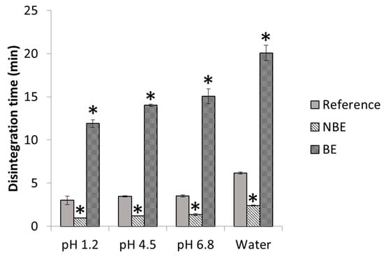 The disintegration studies were performed in different media, simulating pH in the gastrointestinal human tract at pH 1.2, 4.5, and 6.8, and unbuffered water.